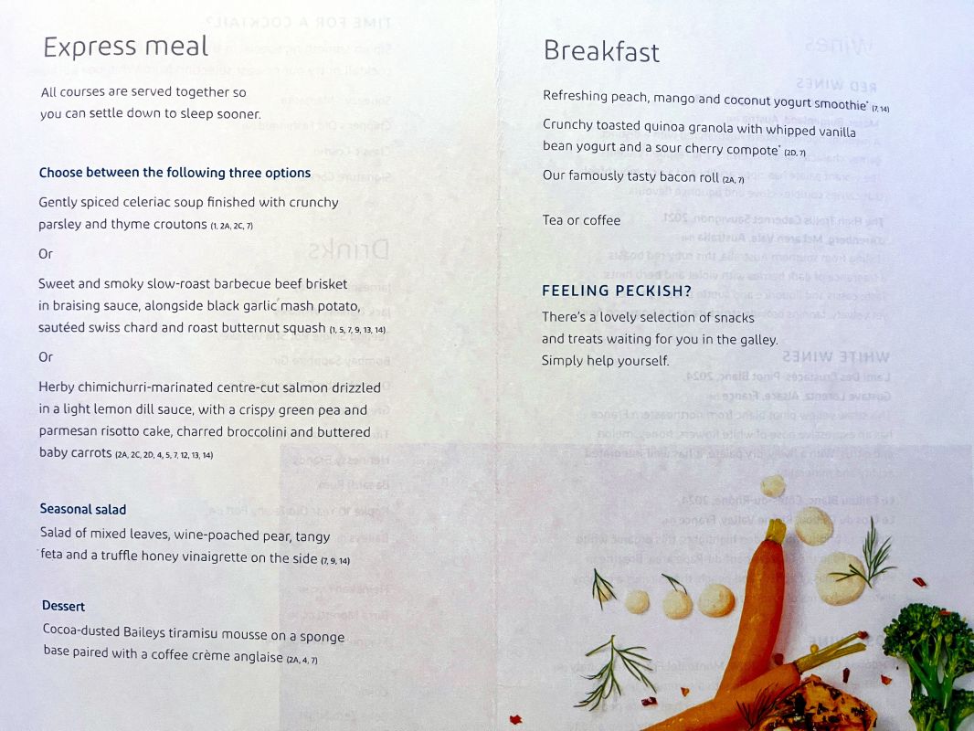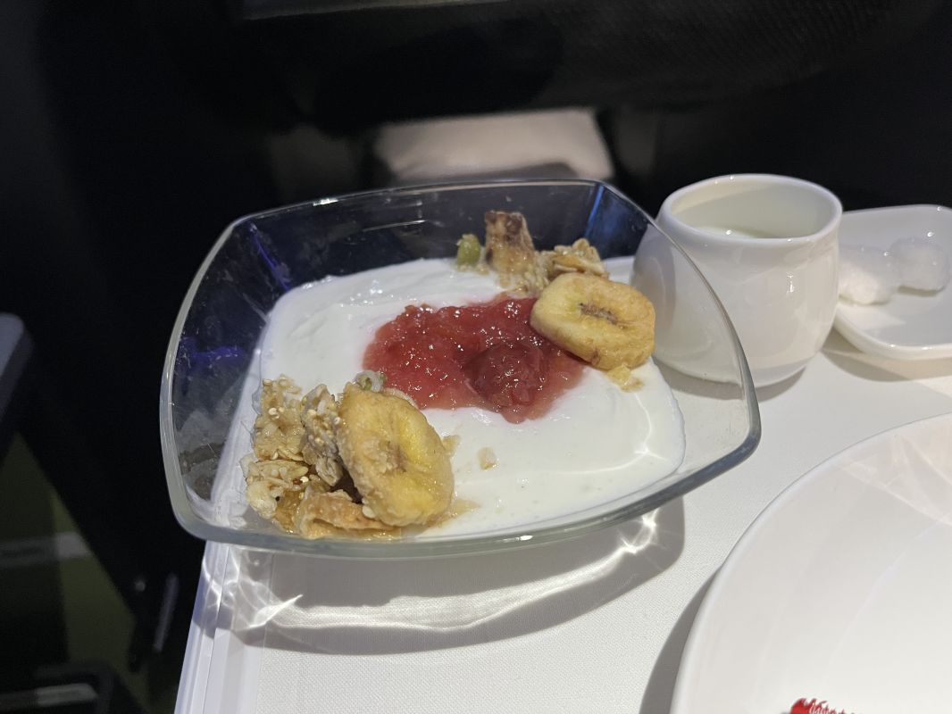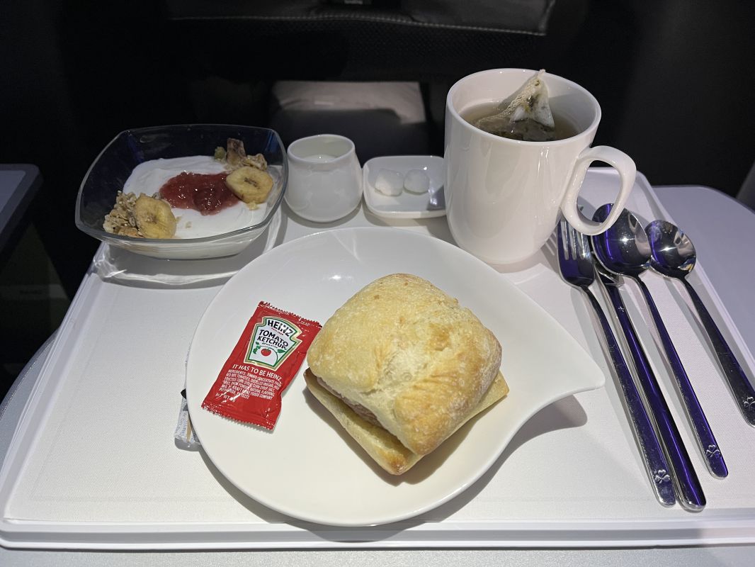 Who likes a Champagne breakfast? I do! So much so that I completely forgot to order myself a peach, mango and coconut yoghurt smoothie. Not to worry! Breakfast comprised of a “Crunchy toasted quinoa granola with whipped vanilla bean yoghurt and a sour cherry compote” along with “Our famously tasty bacon roll.” You can also have tea or coffee so I had a green tea.