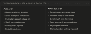 The travelers getting the most value from AI right now are using it like a very fast, very well-read research assistant, not a final authority. They use it to generate options, then verify those options against recent reviews, forums, and occasionally a human who’s actually been there in the last six months.