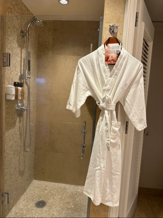 Right when you enter the bathroom, you see the double sinks with ample counter space. On the sink countertop was an amenity box with a shower cap and a vanity kit – a bit on the slimmer side of amenities readily available compared to the Waikiki location, presumably due to sustainability efforts.