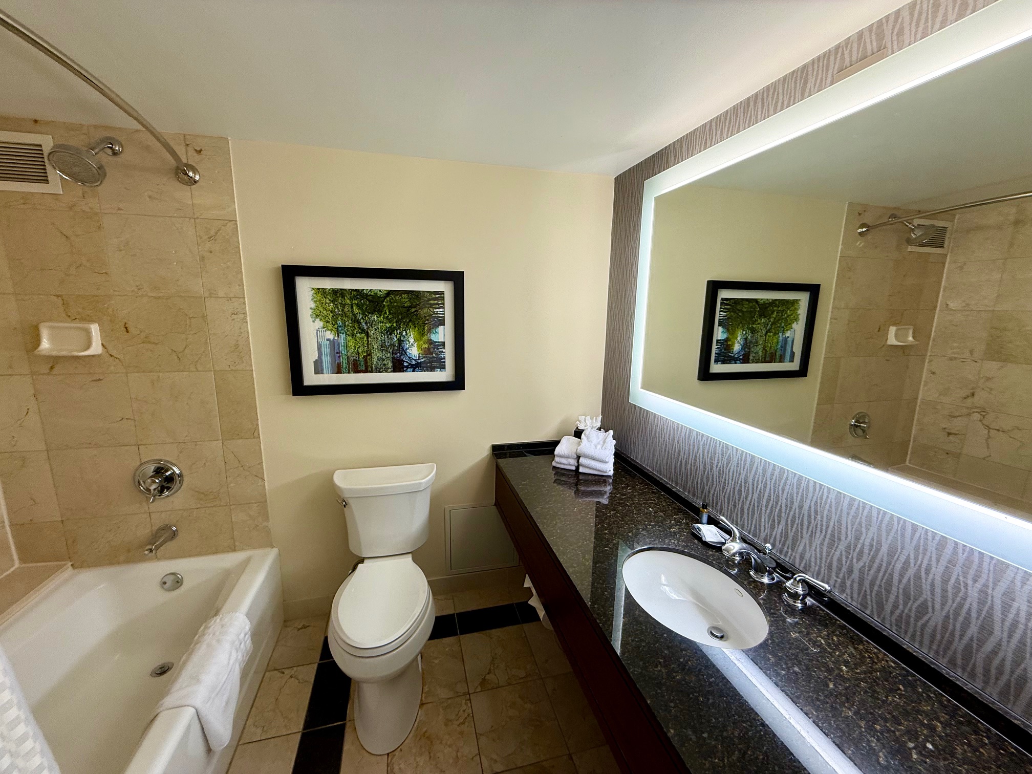 The bathroom is pretty standard. It has a large countertop with a single sink and a shower-tub combo. The most dated part of the room was the tub/shower combo with the old marble and fixtures. The water pressure was also low, which wasn’t the best for a shower.