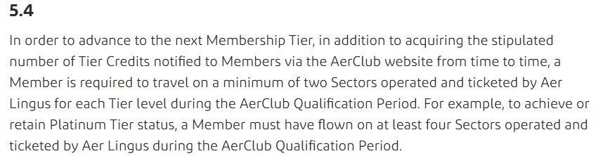 I had no idea until very recently that Aer Lingus has a minimum flight requirement for achieving Silver, Gold or Concierge in their frequent flyer programme, AerClub. Having a look around their website, it’s not immediately obvious at all. In fact, it’s buried in the Terms & Conditions.