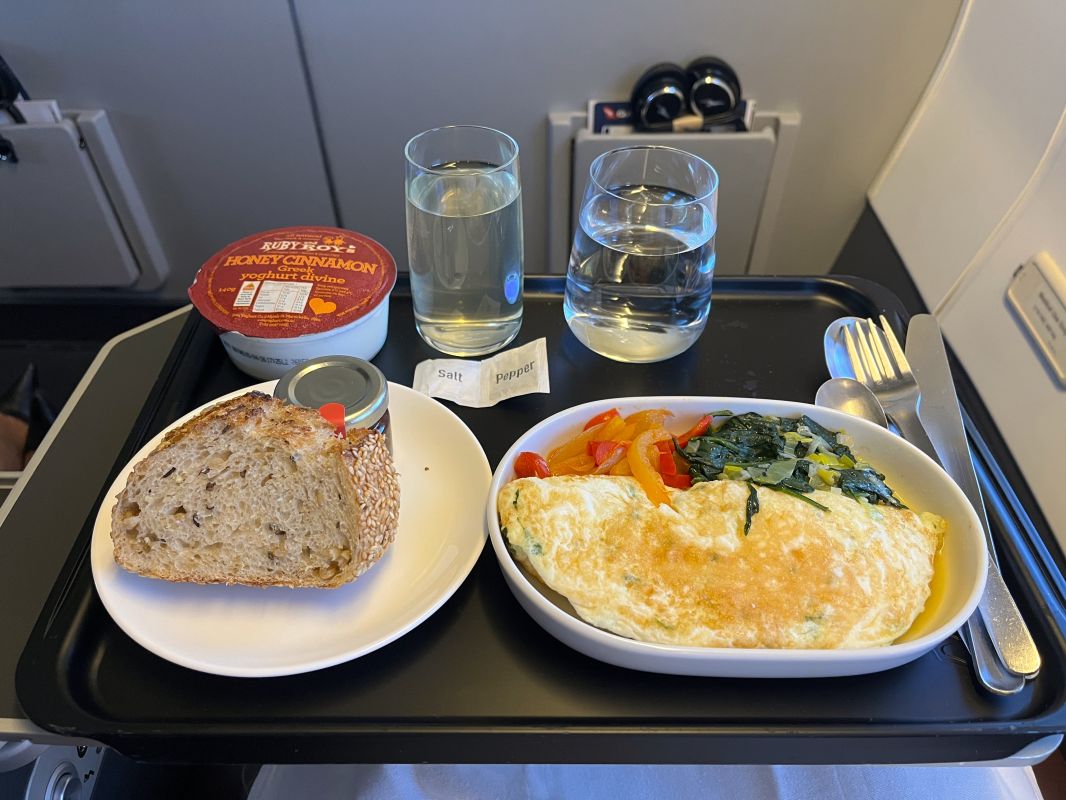 After the safety demonstration we headed for the active runway and were quickly setting course for Adelaide. Friendly service from the crew began quite swiftly and soon I was offered breakfast. I decided to go for the egg white omelette with spinach and vegetables. This came with honey cinnamon Greek yoghurt, bread and jam. To drink I elected to have cold pressed apple juice and water.