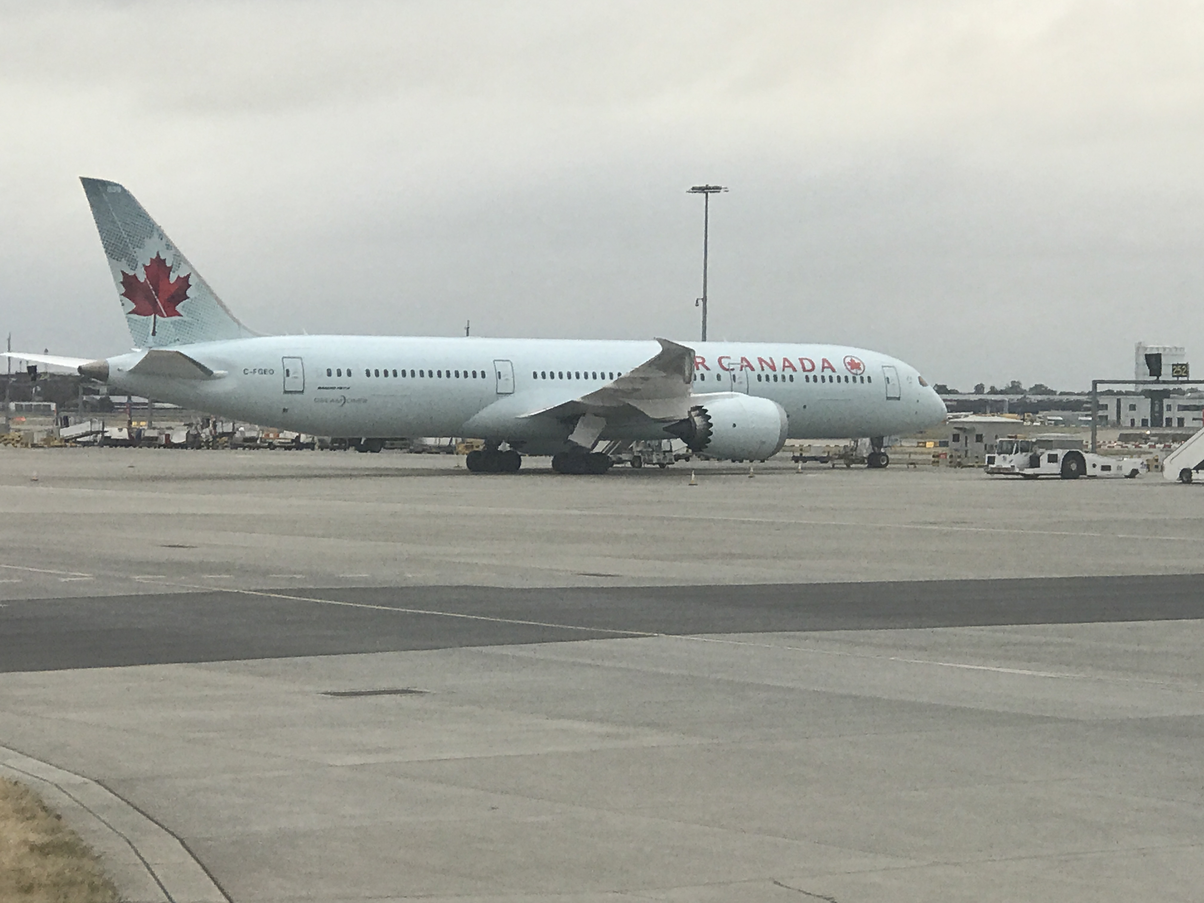 Flight attendants passed around water or juice before take off. I had water, and fell asleep waiting for departure. As soon as we pushed back, I was able to snap a quick photo of an Air Canada 787.