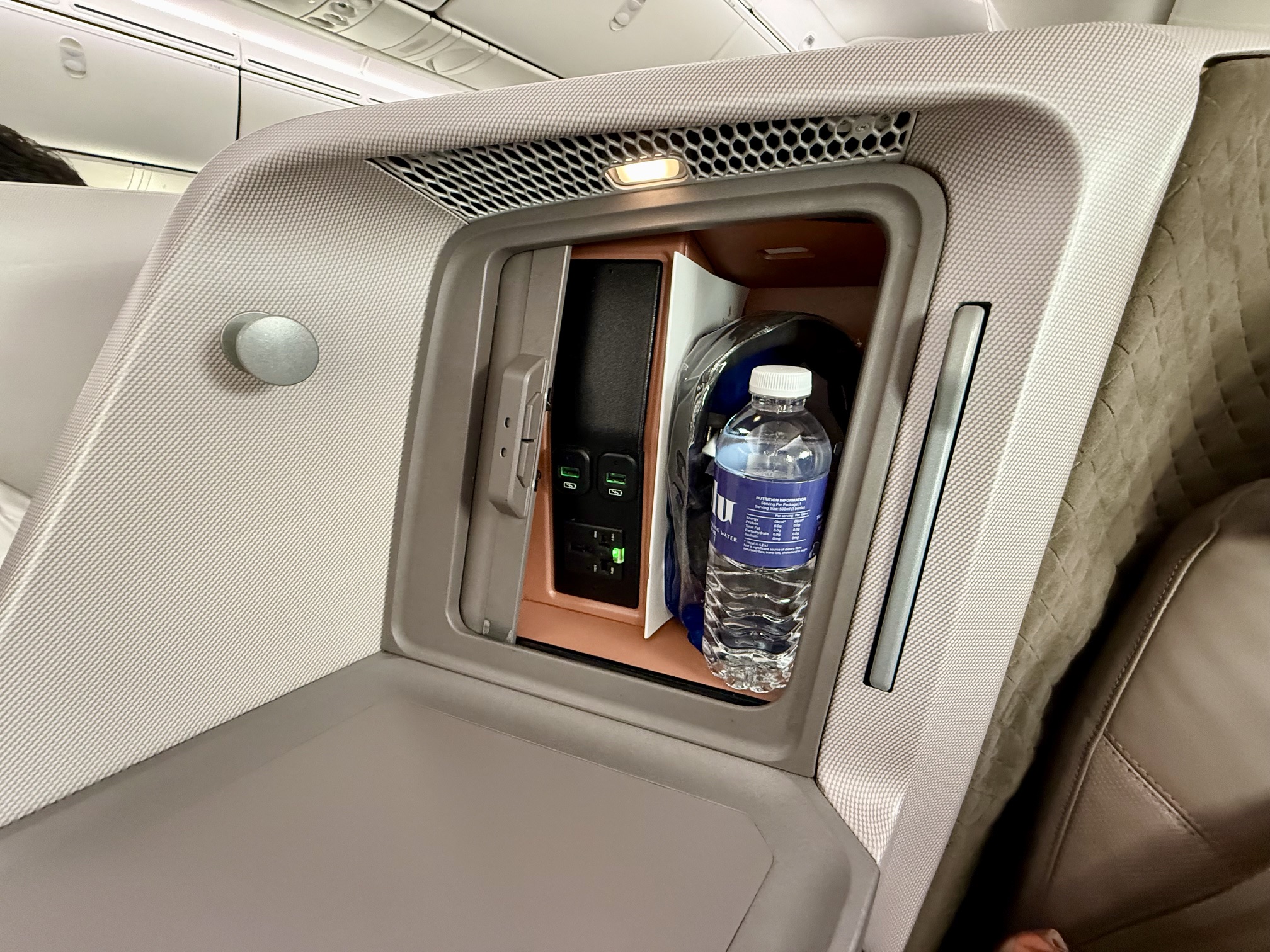 There is a counter surface to the right, as well as a cubby for storage. Upon boarding, the cubby had a full-sized water bottle, headphones, and a paper menu available. There are 2 USB-C charging ports as well as a universal power port.
