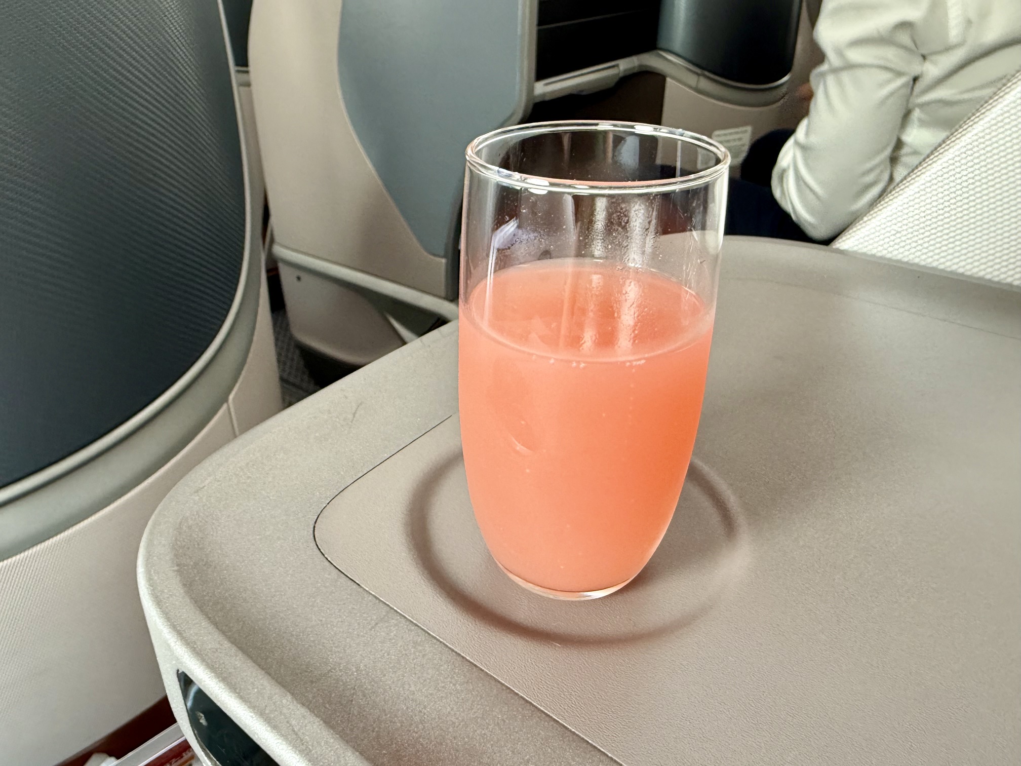 Once settled in, the flight attendants came around with welcome drinks: champagne, a Bellini, or orange juice. A nice touch offering something with a little sparkle on a short flight. Shortly after, the hot towel service followed. The service was attentive and helpful for a short-haul flight.