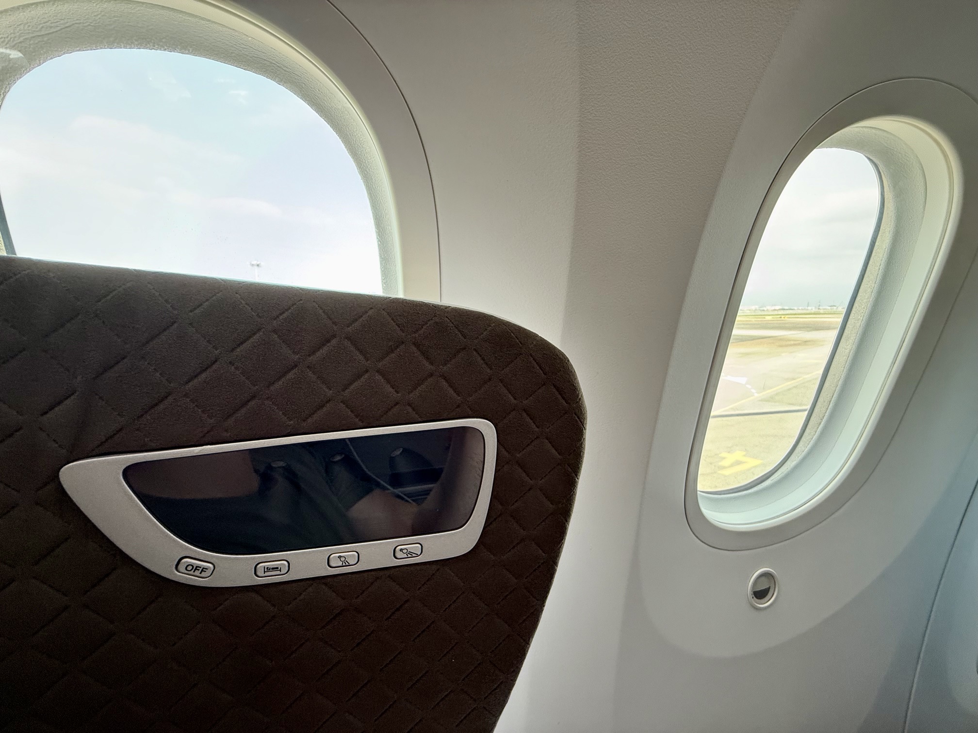 One quirk I found with the design at the window seat was that the headrest extended to the side to offer the light controls, which blocked your view of the window, so if you wanted to see what was going on outside, you’d have to extend your head forward and use the front window to look out of.