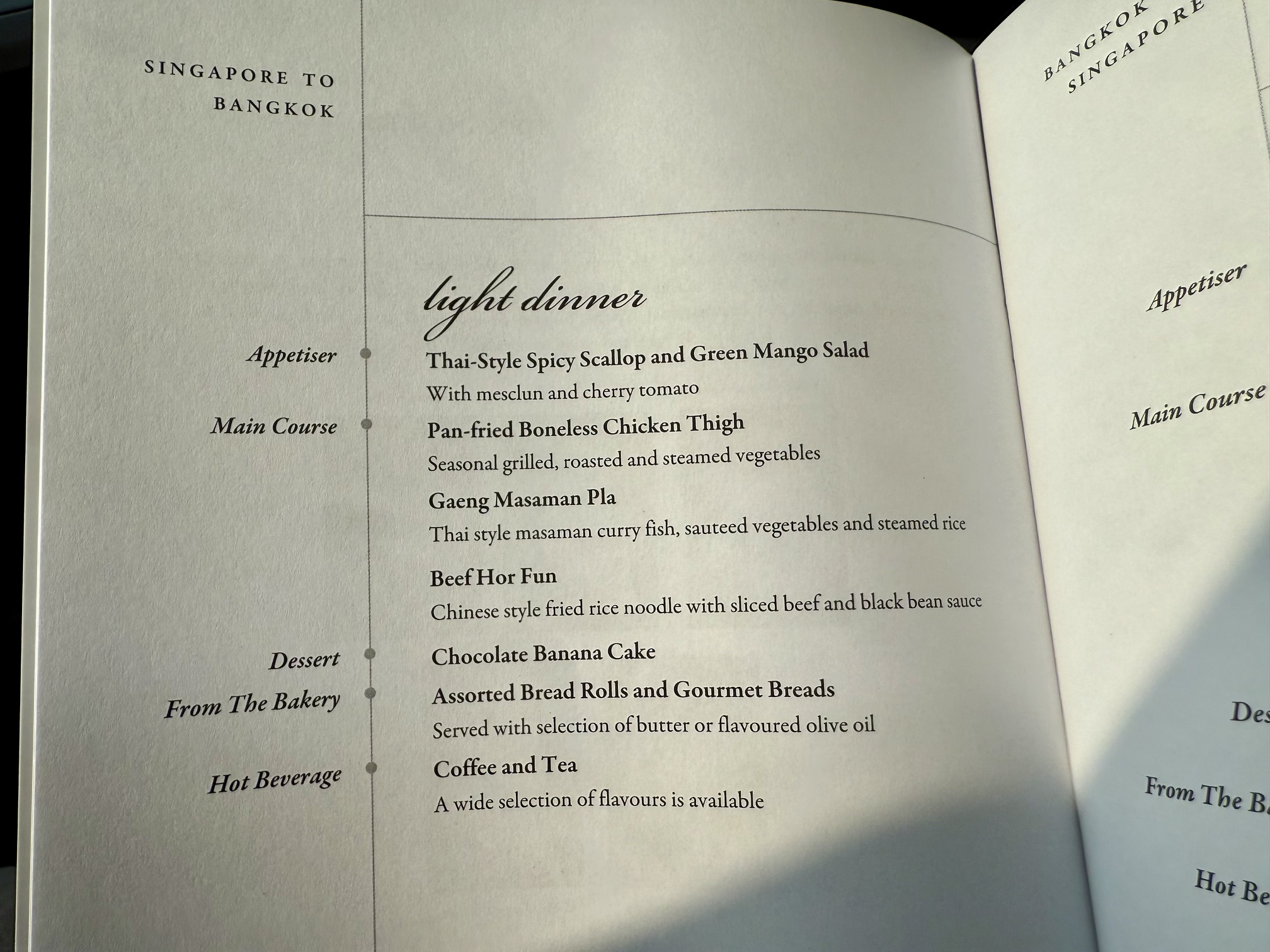 A paper menu was provided, and a light dinner was served.
