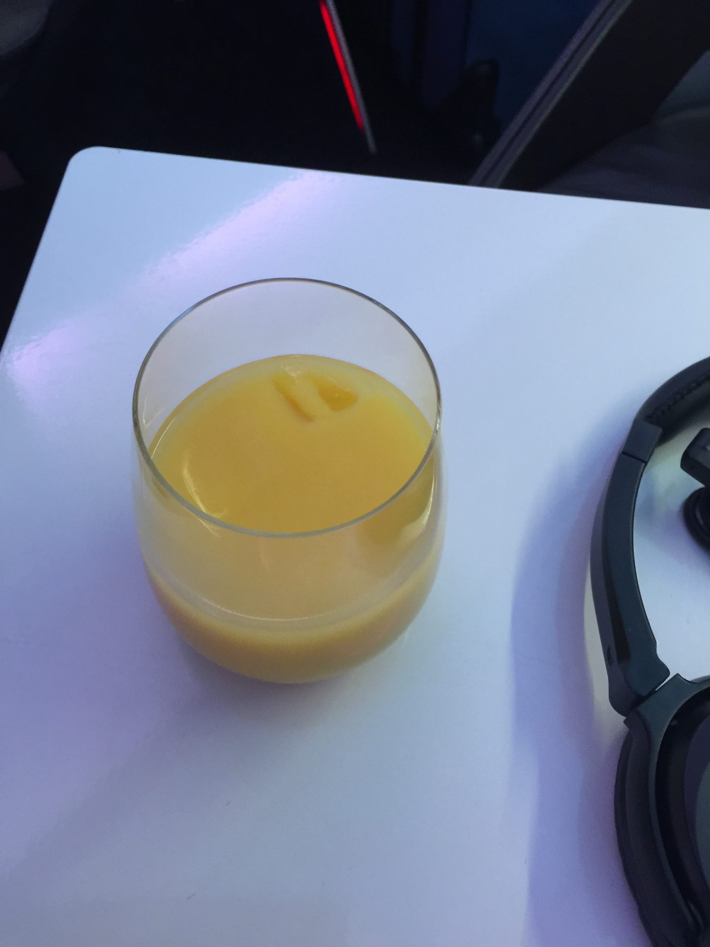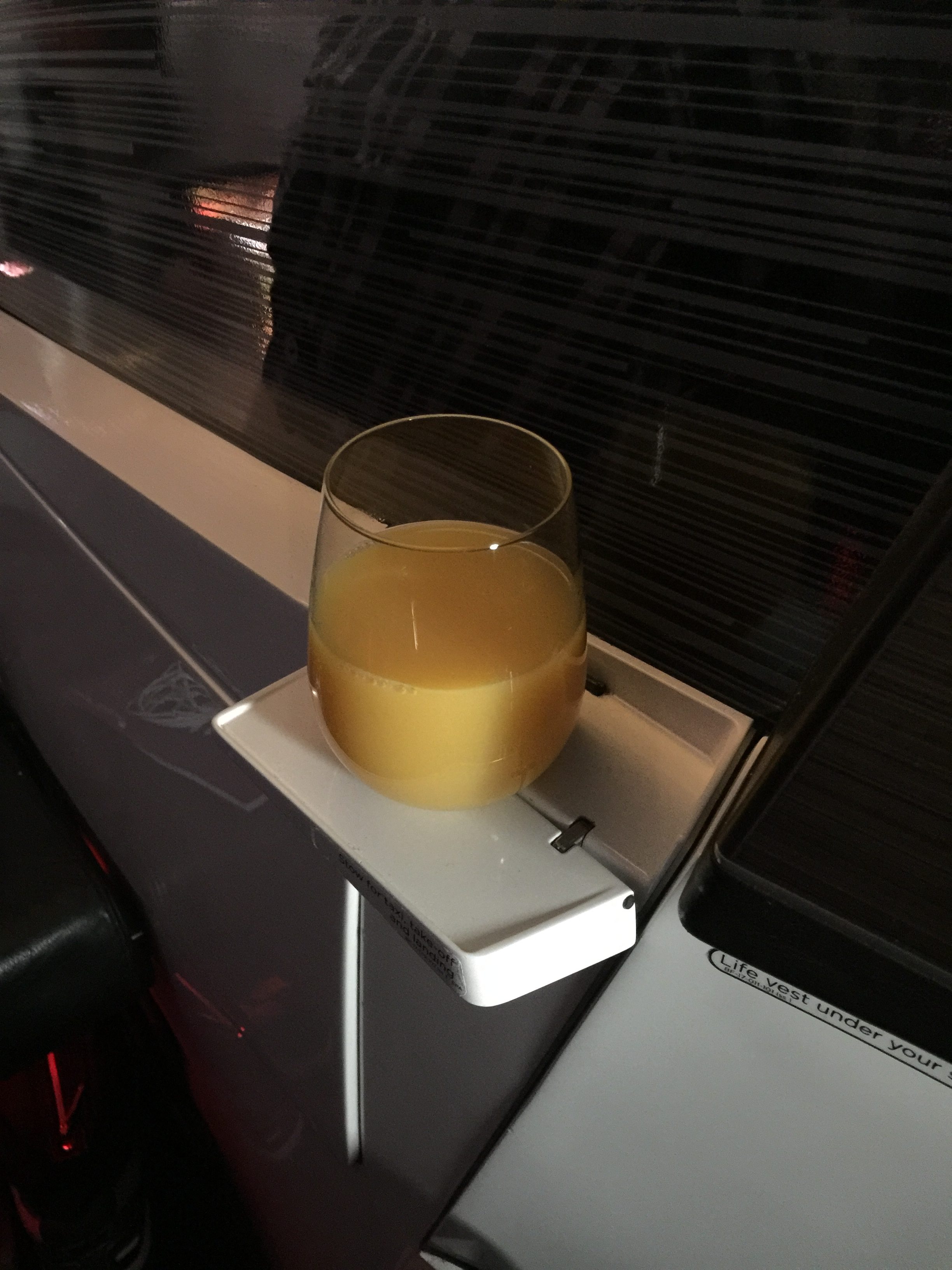 Next to my seat there was a pair of noise cancelling headphones. They were good, but not as nice as Bose headphones give out by other carriers. While I was taking photos of the amenities, the flight attendant that would be taking care of my aisle came by to introduce herself, and offered me a glass of OJ, water or champagne. I picked some orange juice because I am not a big fan of champagne, but it was Gardet Brut Premier Cru, for those who keep track.