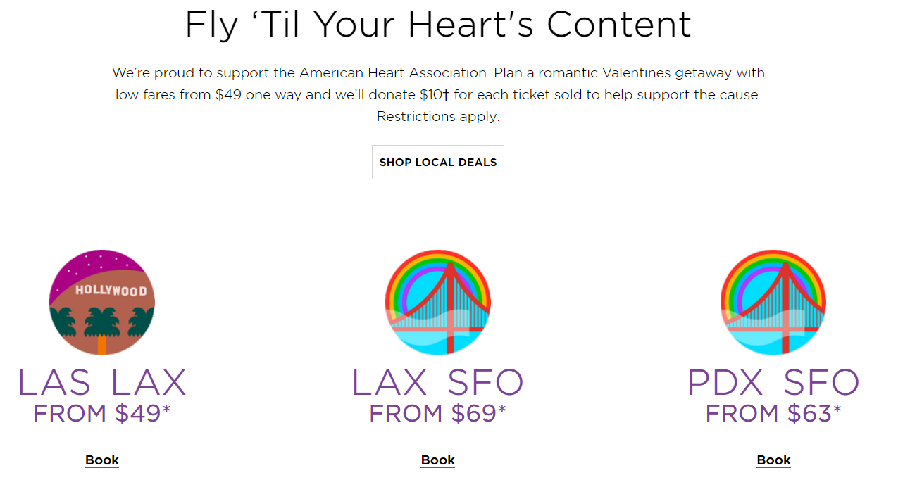 Virgin’s sale of one-way fares starts at a higher $49, but they will donate $10 of each ticket to the American Heart Association. Why not fly cheap and do good at the same time?